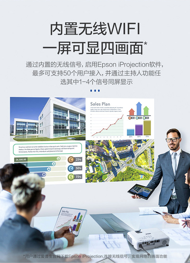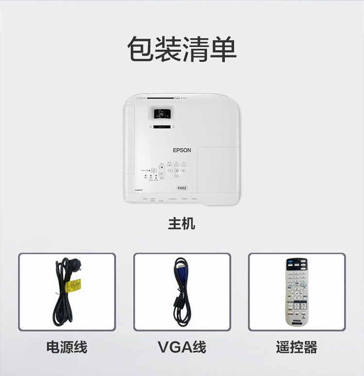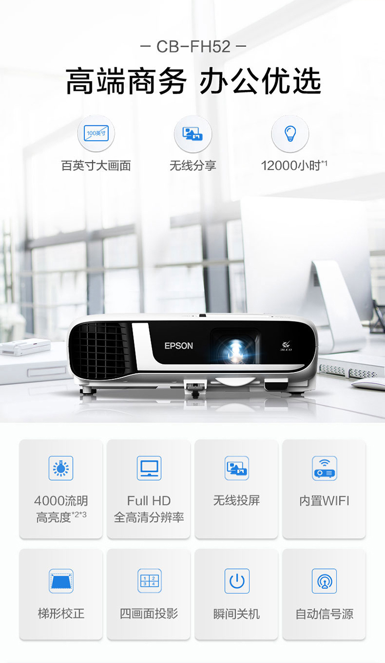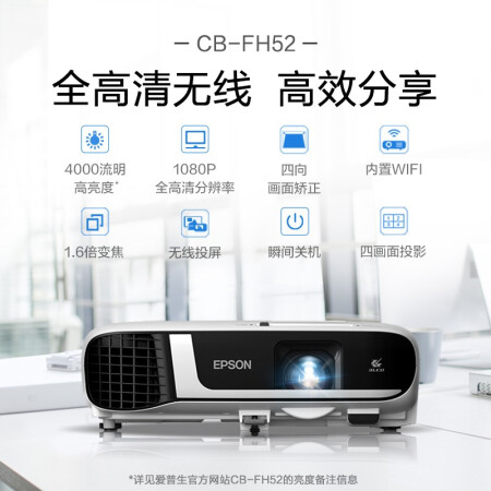 愛普生(EPSON)CB-FH52 投影儀 投影機(jī)辦公 培訓(xùn)(1080P全高清 4000流明 手機(jī)同屏 1.6倍變焦)